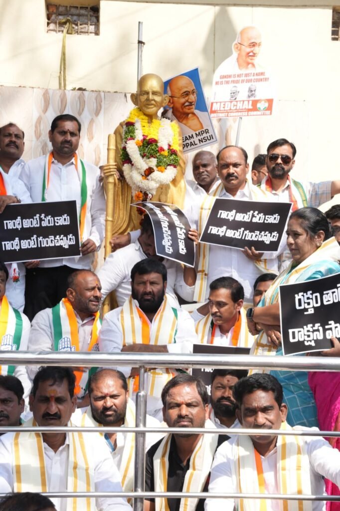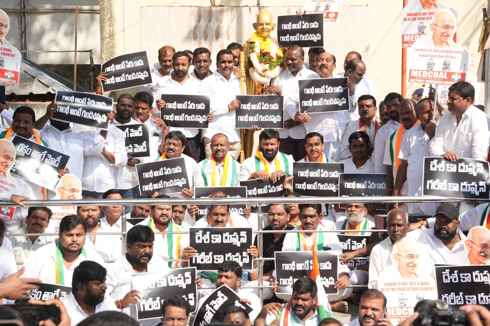 కుత్బుల్లాపూర్: కేంద్రంలోని నరేంద్ర మోదీ ప్రభుత్వం మహాత్మా గాంధీ జాతీయ గ్రామీణ ఉపాధి హామీ పథకం పేరును మార్చాలన్న నిర్ణయాన్ని వ్యతిరేకిస్తూ కాంగ్రెస్ పార్టీ తీవ్ర నిరసన వ్యక్తం చేసింది. ఏఐసీసీ, టీపీసీసీ ఆదేశాల మేరకు మేడ్చల్–మల్కాజ్గిరి జిల్లా కాంగ్రెస్ పార్టీ ఆధ్వర్యంలో మేడ్చల్ పట్టణంలో మహాత్మా గాంధీ విగ్రహం వద్ద శాంతియుత నిరసన కార్యక్రమం నిర్వహించారు.