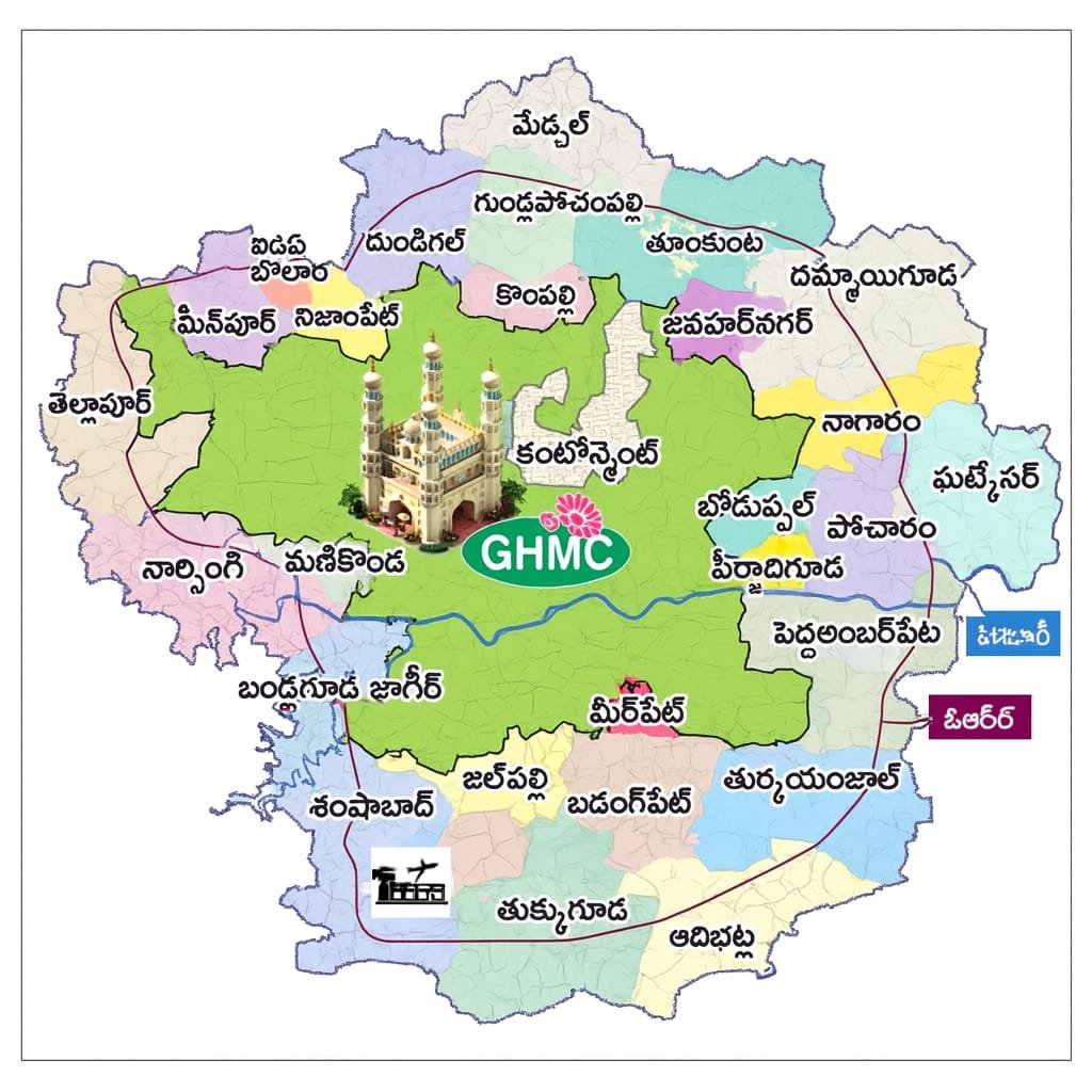 🔸 ఎల్బీ నగర్ జోన్కుమీర్పేట్, పెద్ద అంబర్పేట్, తుక్కుగూడ, దమ్మైగూడ, ఘట్కేసర్, పీర్జాదిగూడ, పోచారం🔸 సికింద్రాబాద్ జోన్కుబోడుప్పల్, జవహర్నగర్, నాగారం, తుంకుంట
