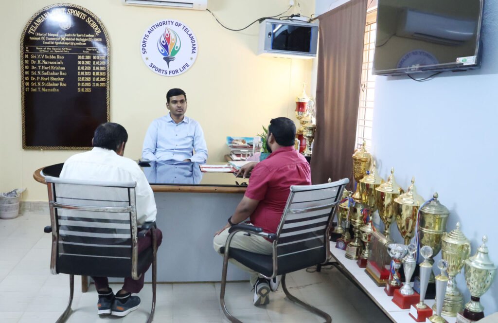 ఈ సందర్భంగా కలెక్టరు మాట్లాడుతూ. స్కూల్లో ఎంతమంది విద్యార్థులున్నారని, ఏయే స్పోర్ట్స్ ఉన్నాయని, కోచ్ లు బాగా ప్రాక్టీస్ చేయిస్తున్నారా అని సంబంధిత అధికారులను అడిగి తెలుసుకున్నారు. కలెక్టర్ పదవ తరగతి విద్యార్థులతో మాట్లాడుతూ విద్య తో పాటు క్రీడలు కూడా ఎంతో అవసరమని, వారికి ఆసక్తి ఉన్న క్రీడల గురించి అడిగి తెలుసుకున్నారు. ప్రస్తుతం ఉన్న స్పోర్ట్స్ కాకుండా అదనంగా ఏమేమి స్పోర్ట్స్ కావాలని విద్యార్థులను అడుగగా, బ్యాడ్మెంటన్, క్రికెట్, కబడ్డీ, స్కేటింగ్, రైఫిల్ షూటింగ్, వాలీబాల్, సైక్లింగ్, హాకీ వంటి క్రీడలకు అవసరమైన గ్రౌండ్, స్పోర్ట్స్ పరికరాలను విద్యార్థులు కావాలని కోరగా కలెక్టర్ పరిశీలించి అందజేస్తామని తెలిపారు. అంతర్జాతీయ క్రీడల పోటీల వరకు వెళుతున్న విద్యార్థుల పై ప్రభుత్వం ఒక్కొక్క విద్యార్థి పై 4 నుండి 5 లక్షల వరకు ఖర్చు చేస్తుందని కలెక్టర్ తెలిపారు.
